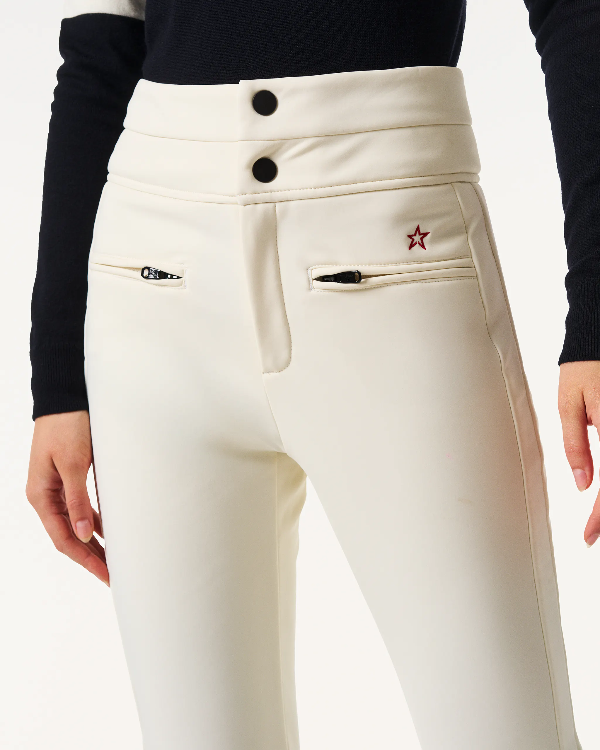 Our best-selling ski pant, the High-Waist Aurora Flare, blends a denim-inspired silhouette with peak performance. Cut to a high-rise fit that hugs the waist and flares from the knee, it delivers both streamlined style and functionality on the slopes. Crafted from Toray Dermizax™ fabric with full water resistance and a thermal fleece lining, it offers warmth, breathability, and freedom of movement thanks to 4-way stretch. Practical features include snow gaiters with silicone grip, boot-friendly zipped hems, anti-tear guards, taped seams for added durability and fitted with RECCO® technology for added safety. New for AW25, the Aurora is now also equipped with Riri lockable snaps, and a taped centre-back seam for enhanced security.