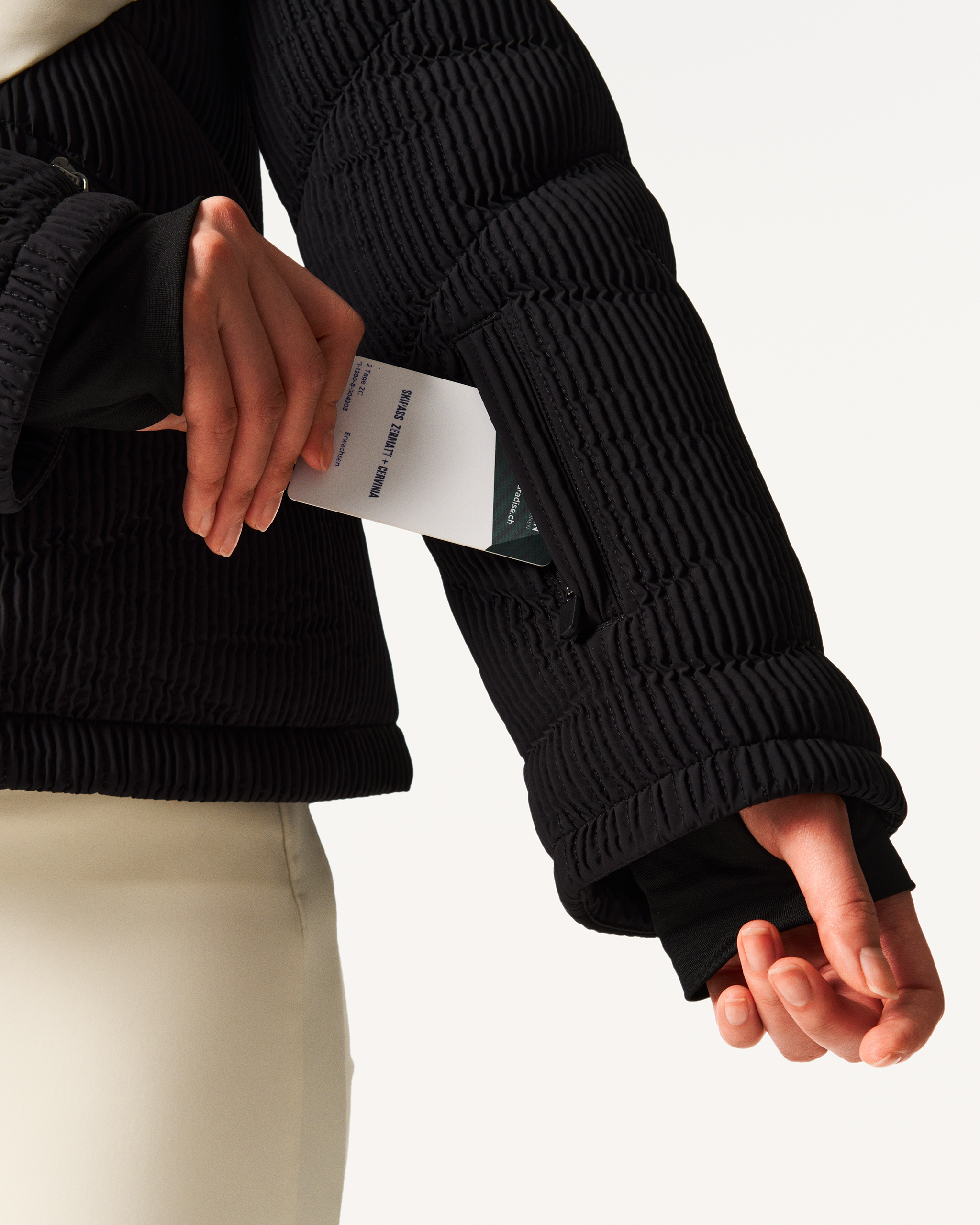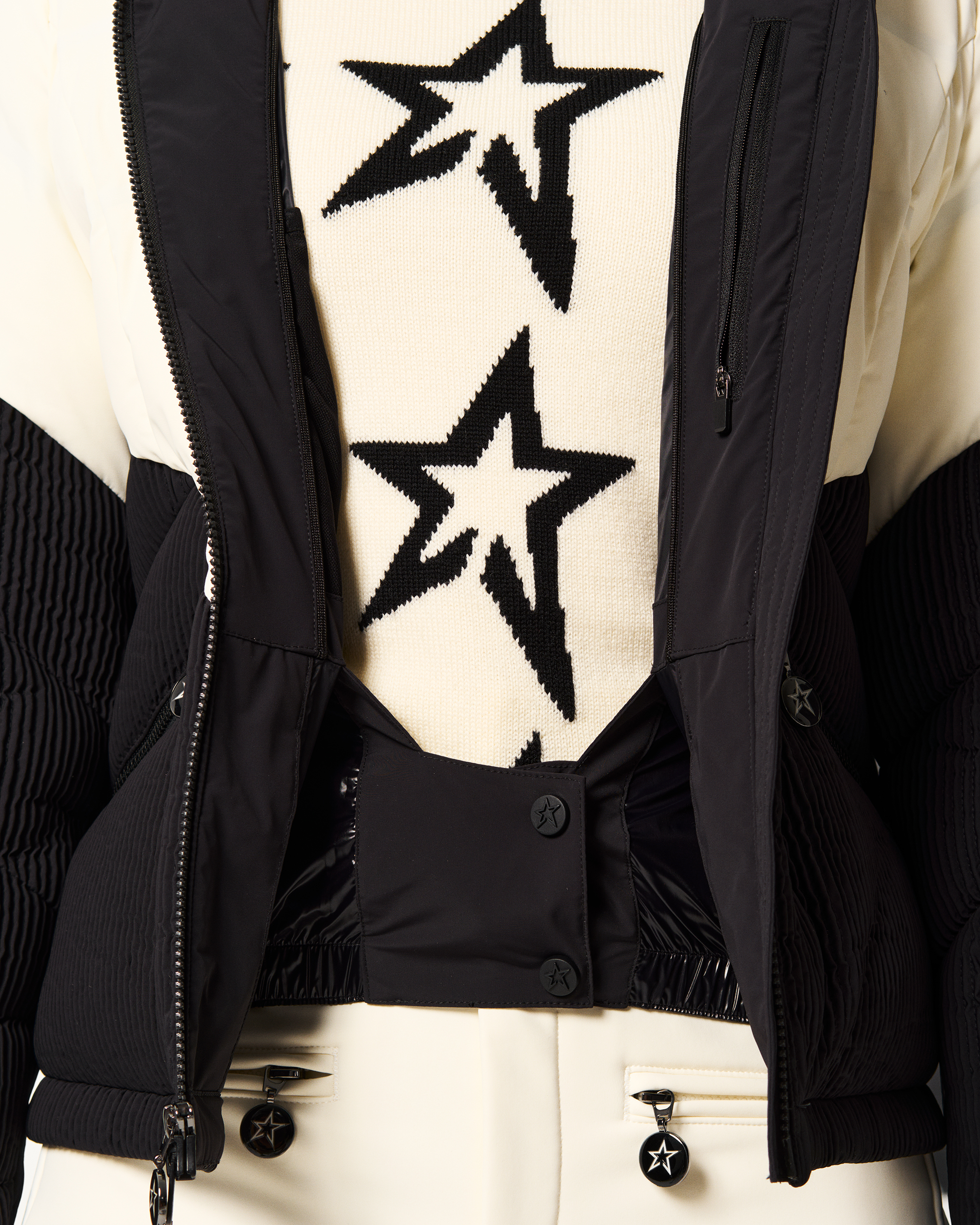 Clean lines, bold contrast—this is alpine minimalism at its finest. The Ski Duvet Down Jacket is tailored for a close fit that sits at the hip, crafted in a striking monochrome palette that brings modern elegance to the mountain. Fully water resistant and insulated with 700-fill-power down, it’s designed to perform in all conditions while maintaining a sleek silhouette. A high-neck collar, adjustable cuffs, and snow skirt offer protection against the elements, while RECCO® technology ensures you're ready for the slopes. Finished with subtle zigzag quilting, this is a cold-weather essential that transcends trends.